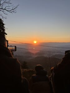 2026年の元旦には、山頂で初日の出を拝むことができました。駐車場は満車で、警備員さんの誘導に従って車道に縦列駐車し、自然歩道コースを歩いて登頂。熊本市内方面の展望所から見る初日の出はとてもきれいで、寒かったですが行ってよかったと思える時間でした。