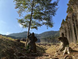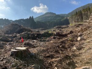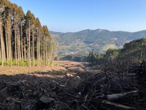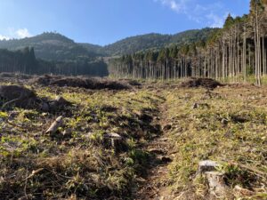 歩き始めてすぐ伐採地帯に入ります。伐採後の今は日陰がほとんどないため、夏場は日差しがかなりきつく感じそうです。