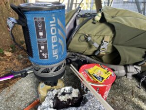 そこまでお腹が空いていなかったので、おにぎりだけのつもりでしたが、体が冷えてきたので予備で持っていたカップラーメンも食べました。お湯を沸かすのはジェットボイルがおすすめで、ほんの数分で沸騰するので、カップ麺やスープ、コーヒーなどにも便利です。無理せずゆっくり休憩して体を温められたのはよかったです。